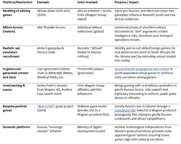 The Kremlin also funds patriotic game development abroad, including African Dawn, a modification of the popular game Hearts of Iron IV. In African Dawn, a game co-developed by Moscow-based African Initiative and a pro-Kremlin gaming streamer, players lead a coalition of Sahel countries (Burkina Faso, Mali and Niger) against Western influence. Its content aligns closely with Russia’s strategic narratives: projecting anti-colonial and Western narratives among young, digitally engaged African demographics. Although the player base is limited, press releases of African Dawn were done in multiple languages (English, French, Russian, Arabic), reinforcing Moscow’s strategic intent to weaponise anti-Western grievances and achieve narrative dominance both domestically and across the continent. In short, it ‘sets out Russia’s agenda for Africa – to increase its influence and discredit Western partners.’