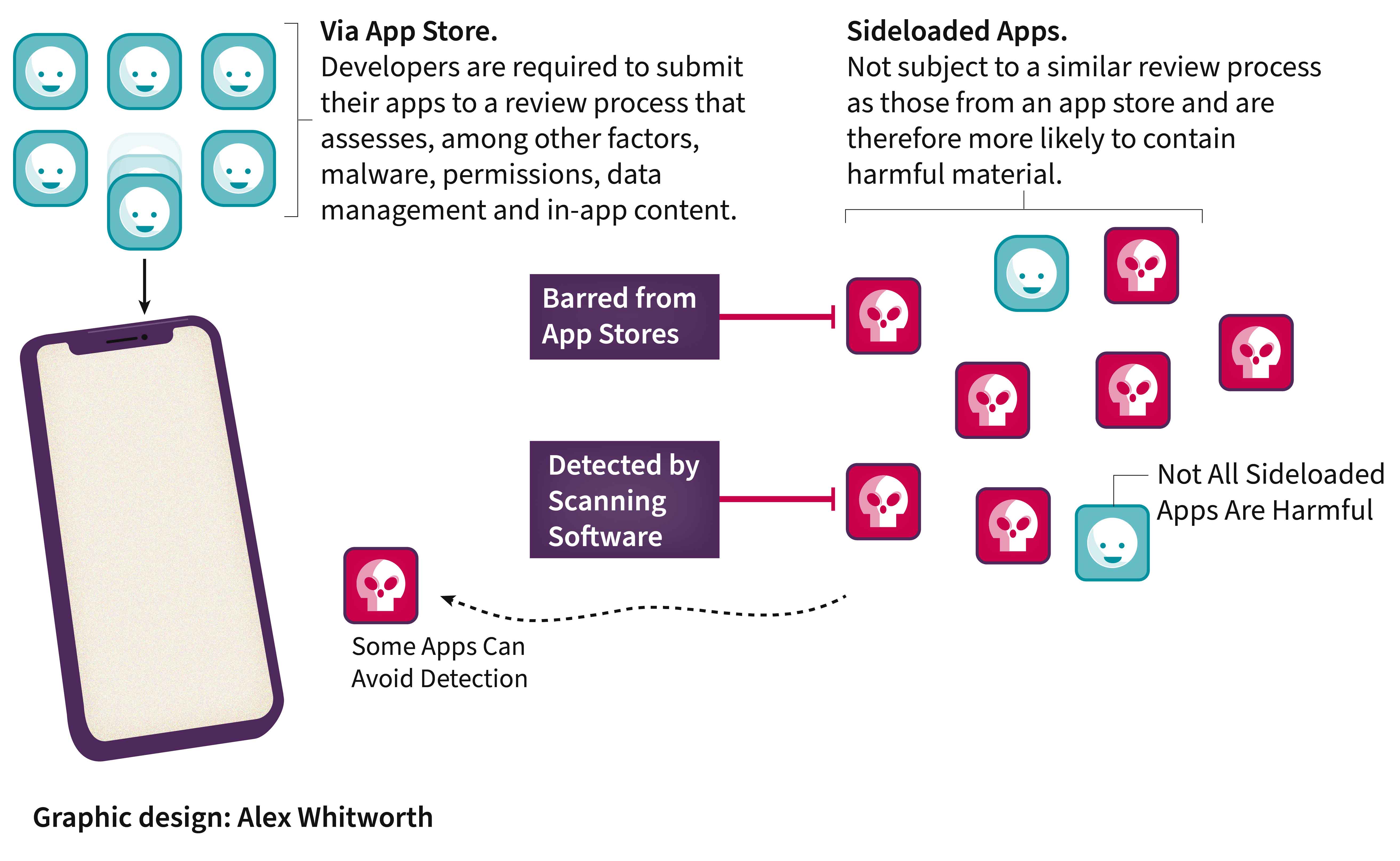 iOS and Android have different approaches to managing sideloading risk. Apple’s iOS is a closed ecosystem: it does not permit access to third-party app stores, so users can only download apps from the Apple App Store. However, competition law, such as the EU Digital Markets Act, has forced revisionsto this policy in the EU. Android, in contrast, is an open OS, meaning users can use other app stores and access apps on the open internet. Provided that certain criteria are met – for instance, developer verification – users can grant permissions for their browsers to sideload apps as well as sideloading through other means. Services such as Google Play Protect scan sideloaded apps, although they can be disabled by users and provide less assurance than app store protections. Legitimate application developers also try to mitigate against malicious sideloaded apps through, for example, monitoring whether host devices have enabled sideloading or restricting the other apps they can interact with.